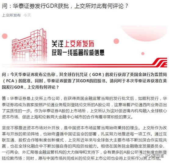 上交所评华泰证券发行GDR获批,认为这意味着沪伦通西向业务迈出了实质性的一步,对促进境内机构融入全球核心资本市场、促进上海和伦敦两大金融中心城市的合作有着非常积极的意义。