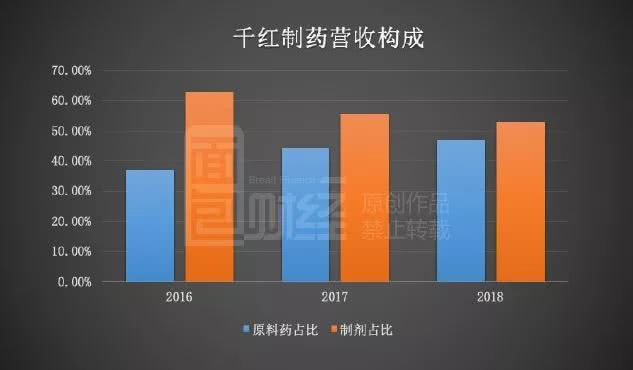 从近三年这两块业务的营收构成可以看到,毛利率较低的原料药占比上升明显,从2016年36.82%上升到了2018年47.17%。与之对应的是,高毛利的制剂药品占比从62.95%下降到了52.81%。