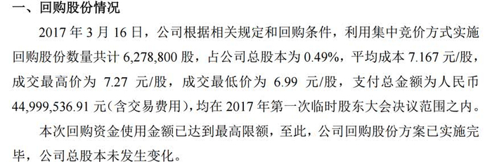 2017年3月,公司再次发布公告称截至2017年3月16日,已累计回购6,278,800股,总金额44,999,536.91元。由于回购使用的金额已达到最高限额,因此回购方案实施完毕。