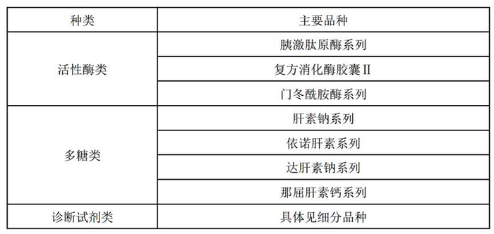公司的主要产品包括活性酶和多糖类两大系列生化药物。其中,活性酶类产品包括胰激肽原酶系列、门冬酰胺酶系列以及复方消化酶胶囊Ⅱ;多糖类产品包括肝素钠系列、依诺肝素系列、达肝素钠系列以及那屈肝素钙系列。