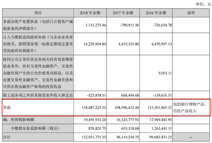 仔细分析可以发现,公司非经常性损益的最重要来源为“其他”项,即包括银行理财产品、信托产品收入,2016-2018年分别贡献1.15亿、1.09亿以及1.18亿。