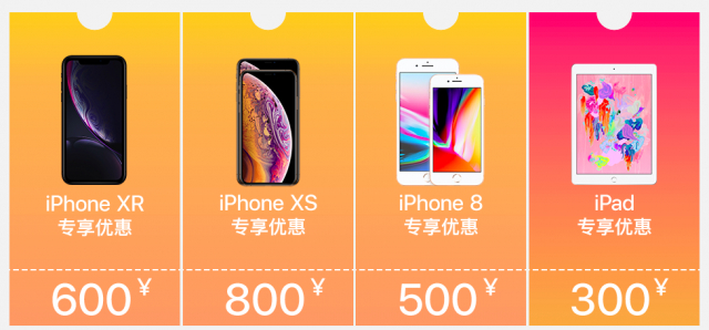根据苹果天猫旗舰店公开的信息显示,iPhone XR专享600元优惠,iPhone XS专享800元优惠,iPhone 8专享500元优惠,同时iPad也有300到400不等的优惠力度。看来,在销量增长乏力的压力下,苹果也不得不加入促销的大军。不过,相比较以往,即便苹果拿出了一些诚意主动降低价格,但是相比较京东、苏宁以及拼多多等平台,价格还不是最优。