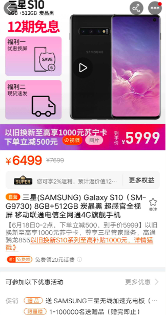 在苏宁易购的平台上,三星S10e和三星S10+价格和京东以及天猫一样,而三星S10 128GB版本售价为5399元,比其它两个平台高10元,512GB版本则会在618当天开启下单立减500元的活动,到手价5999元。