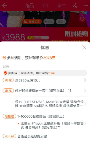 另外,苏宁平台也是如此,价格没折扣,但是618当天购买荣耀20在支付时可以使用每1000减20的优惠券。并且,在618上午10点有抢1000元优惠券的活动,下午两点以及八点还有抢618元优惠券的活动,不过数量也是各一张,只能是拼手速。