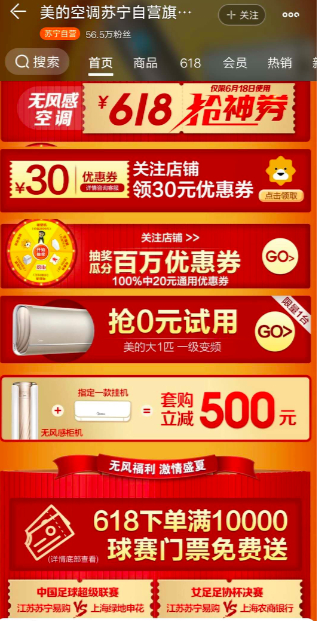 在苏宁易购的平台上,格力、美的以及奥克斯空调的优惠力度跟天猫和京东大致相似。其中,格力也推出了1949元爆款空调产品,通用50元优惠券,指定机型的产品可以参与满10000元减300的活动,部分产品直降最高1400元;美的无风感空调可使用618神券,关注店铺领取30元通用优惠券,无风感空调+指定一款挂机套购立减500元。同时,为了吸引消费者,购买美的空调产品满10000元可以免费领取21日中超主场球票两张;而奥克斯这边,则可以领取20元无门槛优惠券,以及50元和100元限时优惠券。