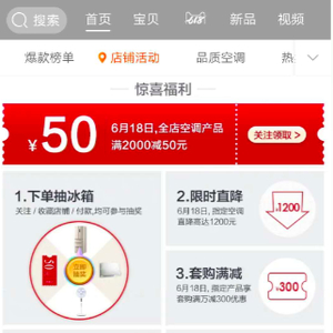 其中,在天猫平台上,格力空调可以领取满2000减50元的优惠券,指定空调产品直降最高达1200元,并且下单可以参与抽冰箱以及花呗免息等活动;美的空调购买指定空调产品就送电烤箱,关注店铺可以领取30元优惠券,爆品空调最高直降1000元;而奥克斯空调在可以领取50元到400元不等的优惠券,其中,100元和50元优惠券无门槛使用,400元优惠券满8000元才能使用。此外,购买奥克斯空调还有机会赢取不同的礼品。