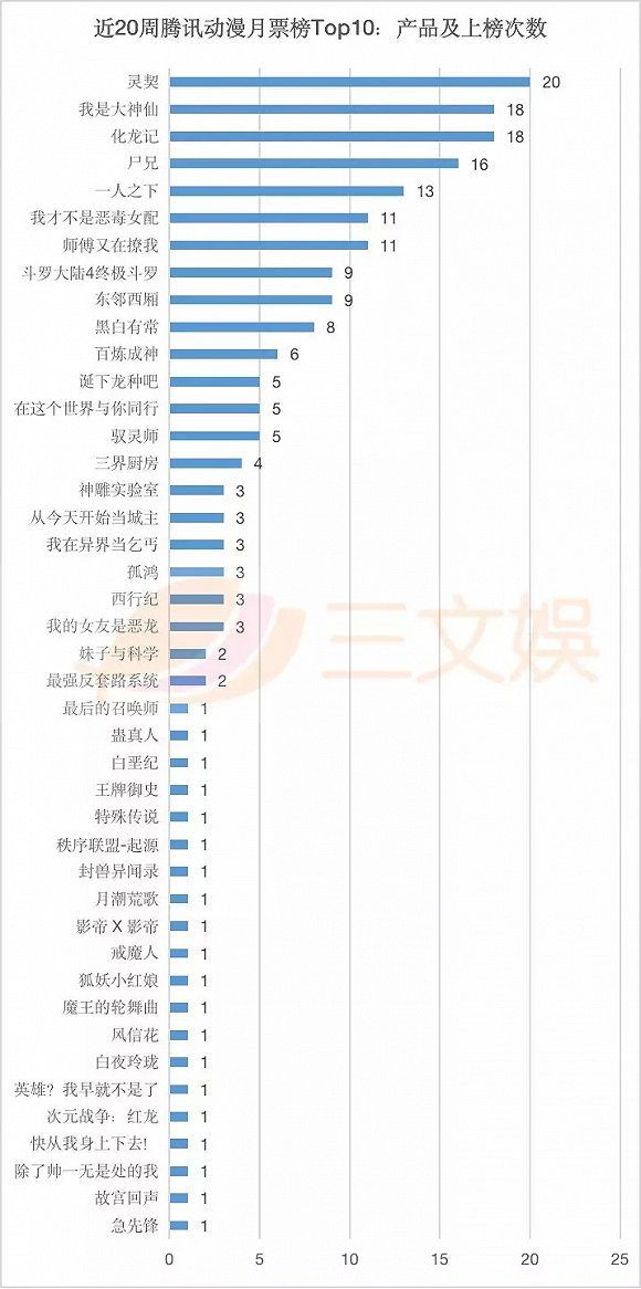 20周里,月票榜Top10出现超过10次的产品,都是腾讯动漫的独家作品。可预见的是,未来平台对于这类头部漫画作品的争抢,会愈发激烈。