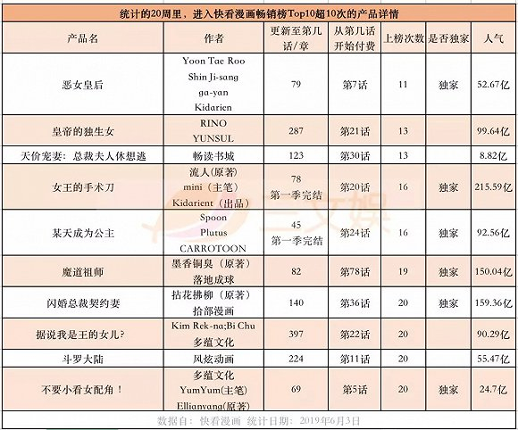 20周里,快看漫画畅销榜Top10的上榜产品有22款。