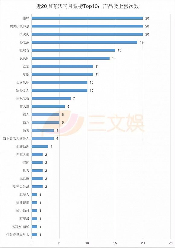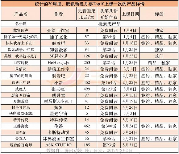 每周,腾讯动漫的月票榜都会清零。在统计的这20周时间里,月票周榜第一位的产品月票数在2000-6000张。