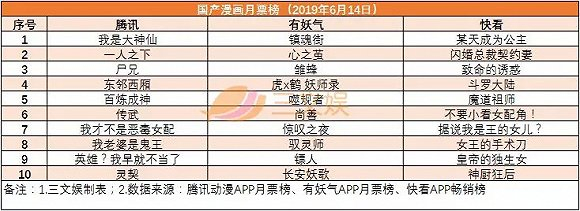 来源:腾讯动漫月票榜全站,快看漫画畅销榜,有妖气月票榜