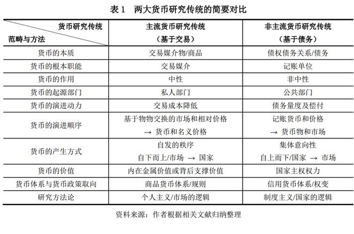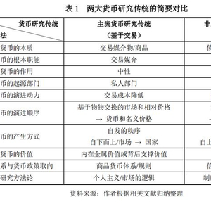 如下表1所示,这两种货币研究传统的鲜明差异,具体源自它们“不同的范畴概念和经济学方法”。对货币本质即根本属性的截然不同的理解,决定了它们对货币根本职能即存在意义的不同定义,同时也决定了它们所赋予的货币在经济中所发挥的不同作用。基于各自所形成的这套相异的基本货币理论,它们刻画出有关货币产生和演进的两种针锋相对的货币历史。而这种“虚构的”货币历史,又同各自的货币理论图景相互支撑和强化,从而为各自迥乎不同的政策含义提供了基础和依据。并且,它们这些理论和政策范畴的歧见还不可避免地体现在方法论上的分野,同时又被这种不同的研究路径所“锁定”。