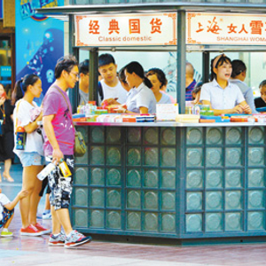 上海南京东路步行街,不少顾客在专卖“雪花膏”化妆品的小商铺挑选化妆品。 人民视觉