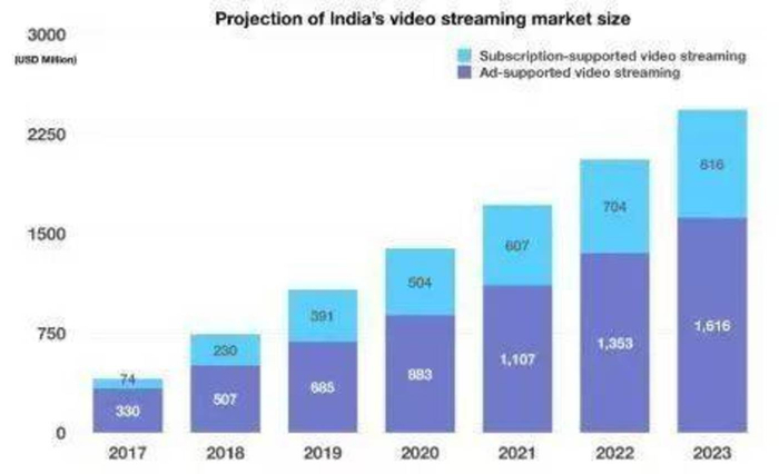 而印度,正是全球最火热的媒体市场之一。根据Media Partners Asia的预测,到2023年印度的电视和数字视频市场规模将达到24亿美元。