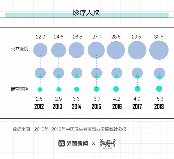 不仅如此,数据还给出了残酷的现实:公立医院无论是从病床数还是就诊人次上,远远超过民营医院,这意味着,公立医院人满为患而民营医院的大量人员床位利用率不高,处于闲置状态。