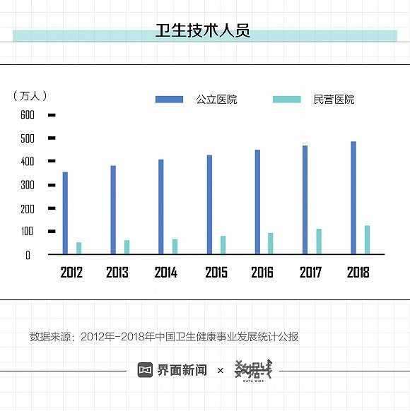 在医疗技术人员分布上,民营医院向来不是首选,医疗技术人员总量在50-100万人左右徘徊,而同时期的公立医院早已经跑在了300-400万人的档位。