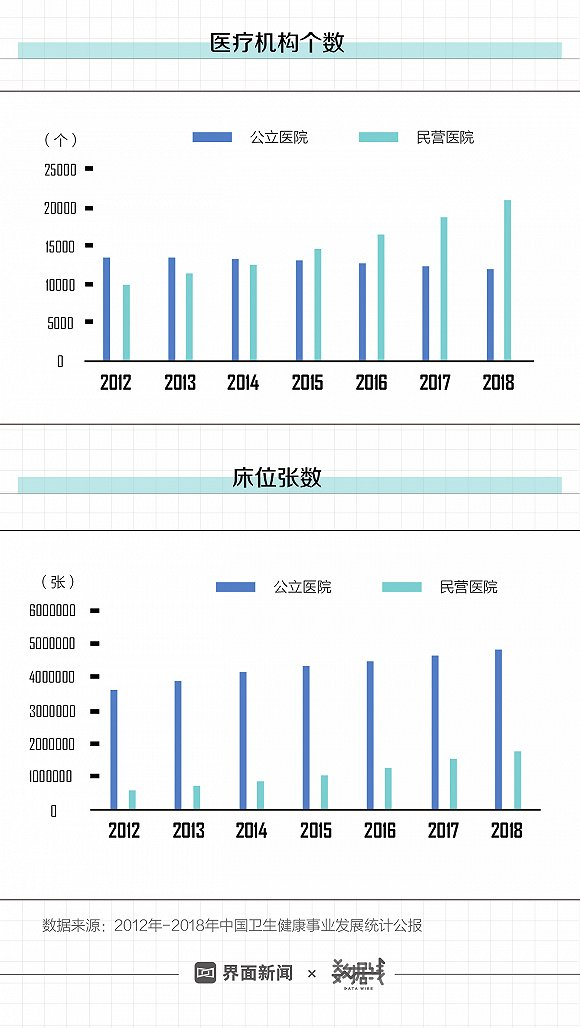 事实上是,公立医院的发展脚步并没有被控制住。根据界面新闻整理的《2012-2018年健康卫生统计年鉴》数据得出,公立医院的涨幅在缩减,但势头依旧走高。每千人口医疗卫生机构床位数由2017年5.72张增加到2018年6.03张。这说明,严控的政策执行并不到位。
