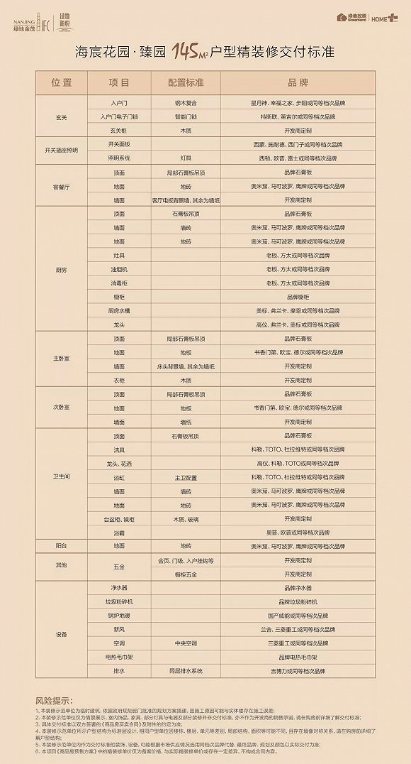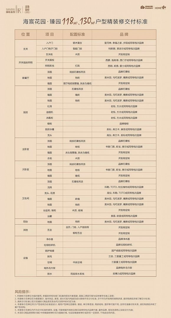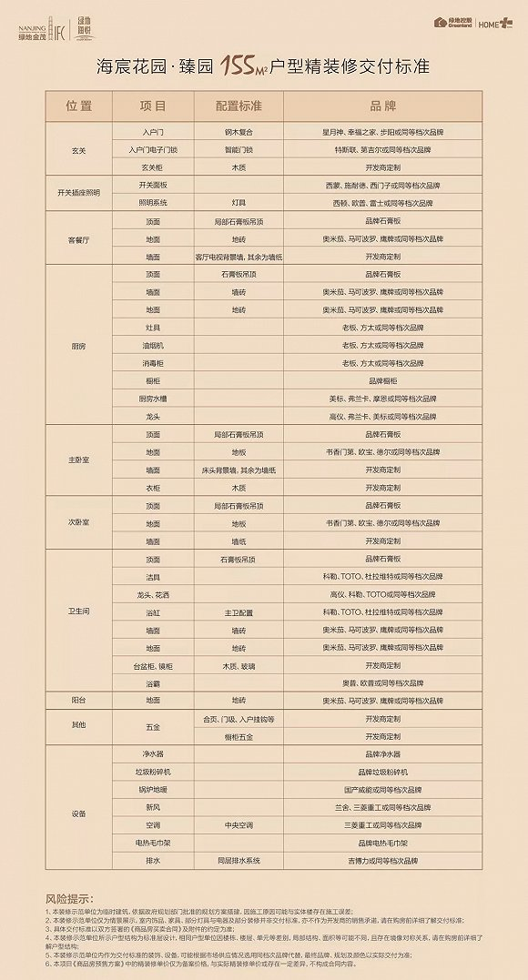 据了解,绿地海悦此次的精装标准与前期相比,品牌、标准方面都有所升级,精装标准为3980元/㎡,与之前物价表上数据持平(具体以开发商通知为准)。