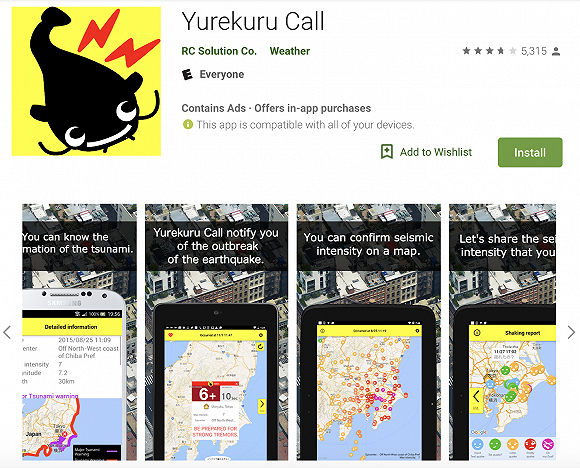 在日本较为常用的则有“小鲶鱼” Yurekuru Call(ゆれくるコール)和Yahoo!防灾速报(Yahoo!防災速報),两款应用程序分别拥有500万与1500万用户,其中Yurekuru Call会直接发布日本气象厅的地震与海啸警报,用户可以在程序内输入姓名与电话号码,登记自己是否安全,让亲友们放心,而Yahoo!防灾速报除了发布地震和海啸预警,还会通知暴雨、大雪、洪水等极端天气灾害。