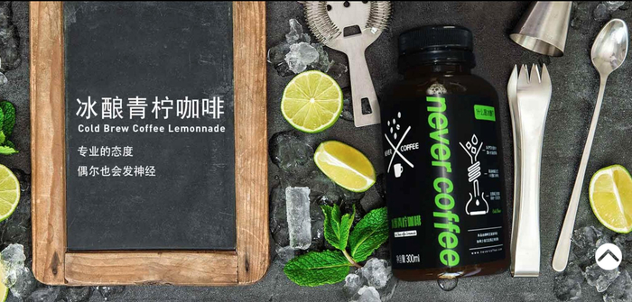 Never Coffee的品牌定位是精品罐装咖啡,采用埃塞俄比亚、哥伦比亚等地的咖啡豆,用德国Probat炉子进行烘焙,再加压冷萃。最后才有了冰酿黑咖啡、冰酿青柠咖啡和冰酿拿铁等产品。
