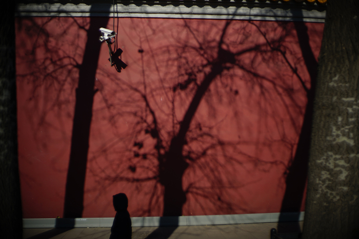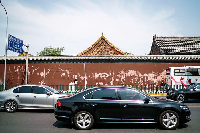 北京,红墙与树木、人的倒影。(摄影:杨一凡)