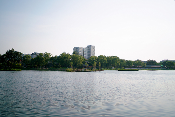 北京西海一景。跨过湖面看过去,远方的建筑物仿佛身处一座岛屿。