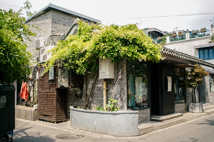 北京后海附近一处四合院建筑,虚掩的大门可以看到内里建筑物的颜色。