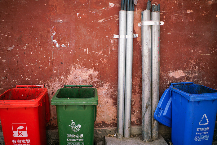 北京五道营胡同附近,三个颜色迥异的分类垃圾桶。