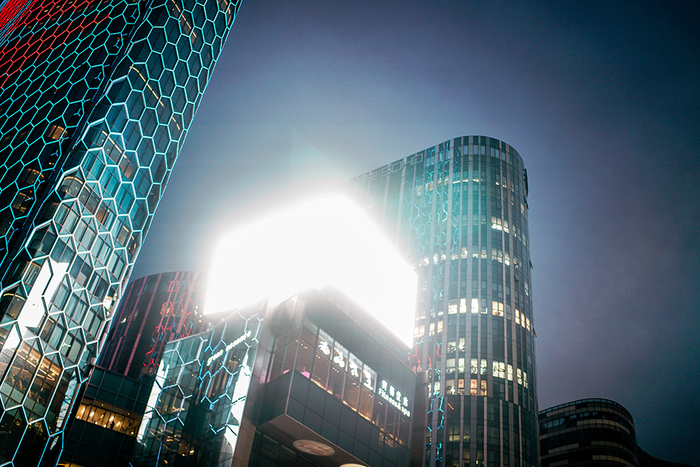 北京三里屯SOHO。醒目的广告屏幕,在夜晚发着夺目的光。
