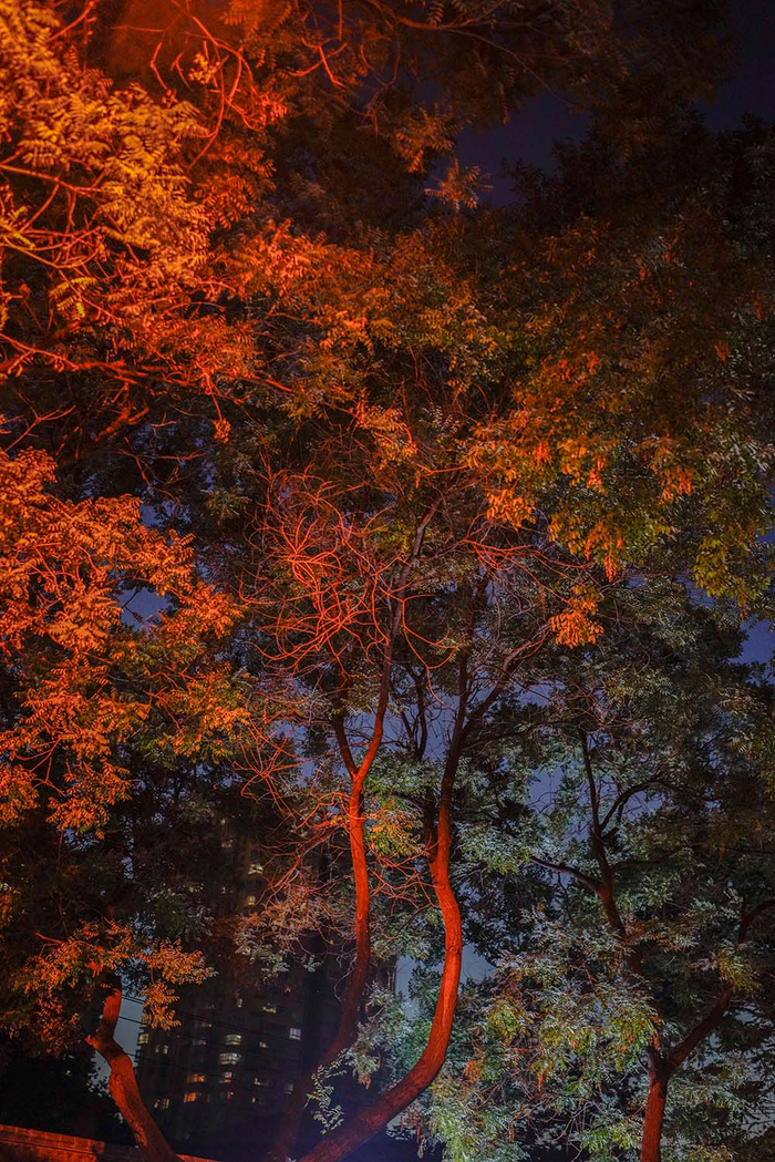 北京十里堡路夜景。路灯往往会影响街景的颜色,尤其是在树木枝叶繁茂的夏季。