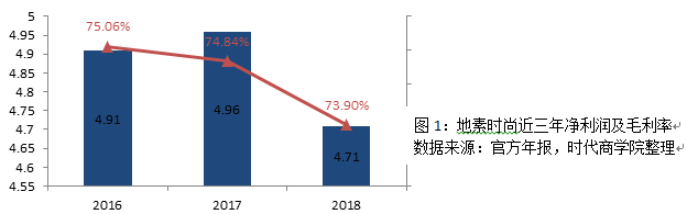 通常来说,不管是净利润还是扣非净利润,其影响因素均与销售毛利率有关。我们在对比了地素时尚近三年的销售毛利率发现,该项指标确实存在逐年缩减的现象,2016—2018年,其销售毛利率分别为75.06%、74.84%及73.90%,三年间下跌了1.16%。