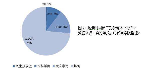 截至2018年年底,地素时尚员工人数总计2590人,其中销售人员占比76.5%,达1982人。根据该公司披露的员工受教育程度信息显示,74%的员工处于大专学历以下(图二)。由于地素时尚的品牌是面对高端消费者的定位,销售人员作为公司直接面向用户的桥梁,在聘用环节更应谨慎对待。