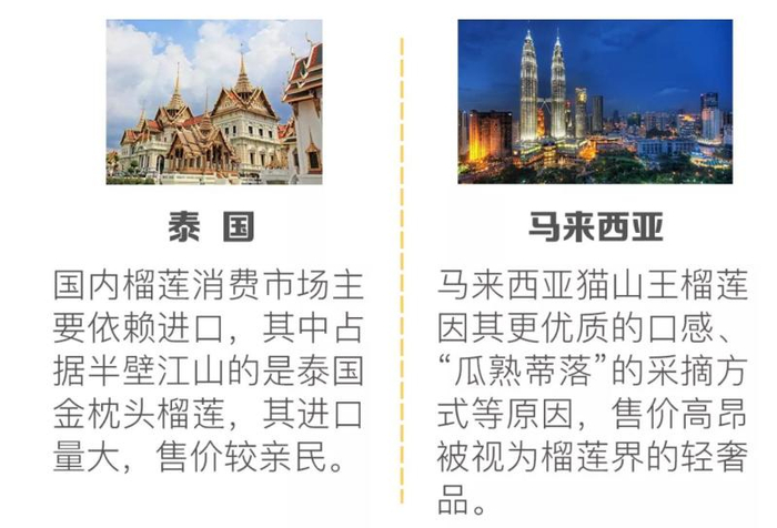据介绍,榴莲的主要产地有泰国、越南、马来西亚等热带国家,我国的广东、海南等地也有部分种植。其中,泰国是榴莲生产的大户,其榴莲品种主要有金枕头、干尧、青尼等;越南榴莲的主要品种为干尧;而马来西亚的榴莲主要品种有金凤、苏丹王,以及更高级的“猫山王”。记者从上海海关了解到,泰国的金枕头榴莲占据了我国榴莲进口的半壁江山,其价格也较为亲民,而马来西亚“猫山王”因不打催熟剂,不到成熟时不采摘,严格恪守“瓜熟蒂落”原则,其售价也就相应昂贵,成为榴莲界的轻奢品。目前从市场批发价来看,冷冻带壳“猫山王”一箱20斤价格为1200元,而新鲜的泰国金枕头30斤价格在700元左右。