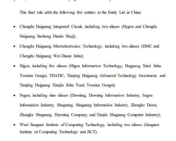 美国商务部在当地时间6月21日公布的一份文件显示,其新增五家禁止美国供应商采购部件的中国实体。这五家实体包括天津海光、中科曙光、成都海光集成电路、成都海光微电子技术以及无锡江南计算技术研究所。