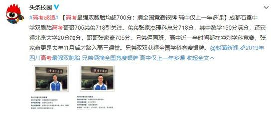 据媒体报道,成都石室中学的双胞胎理科兄弟张家杰和张家豪可谓本届高考最强双胞胎,弟弟张家杰理科总分718分,其中数学获满分,外语148分。哥哥张家豪也取得了705分高分。哥哥张家豪在直播中表示,自己心仪的学校和专业是清华北大的微电子,因为现在国家确实很需要芯片设计方面的人才。