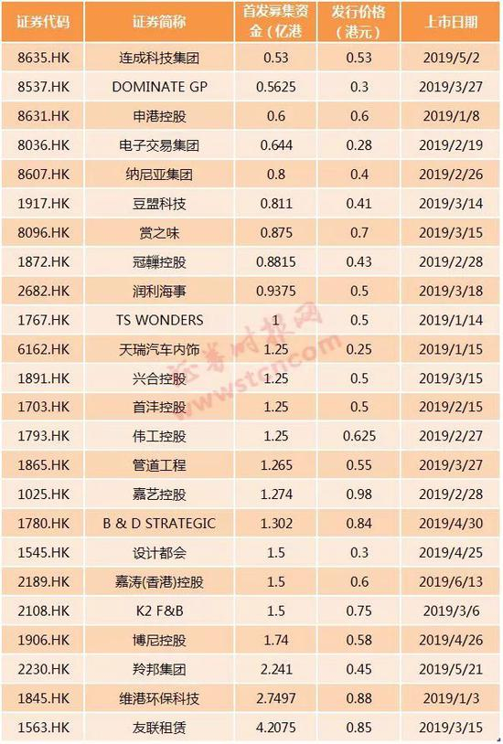 很多股票发行价本来就不高。数据显示,2019年以来,一共有66只新股在香港上市,其中发行价在1港元以下的有24只,占比36%,募集资金大部分集中在5000万港元-2亿港元之间。