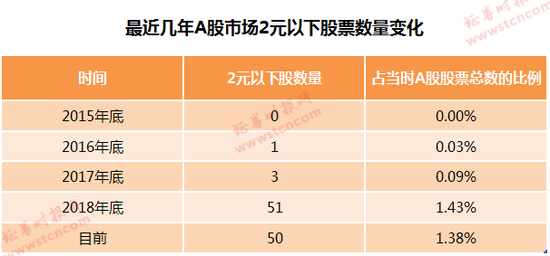 数据显示,2015年底,A股市场尚无一只股票股价低于2元。2016年底,出现1只。2017年底,增至3只。