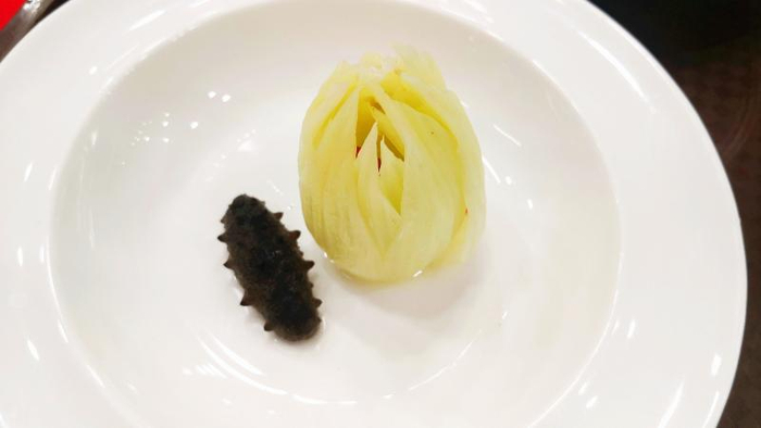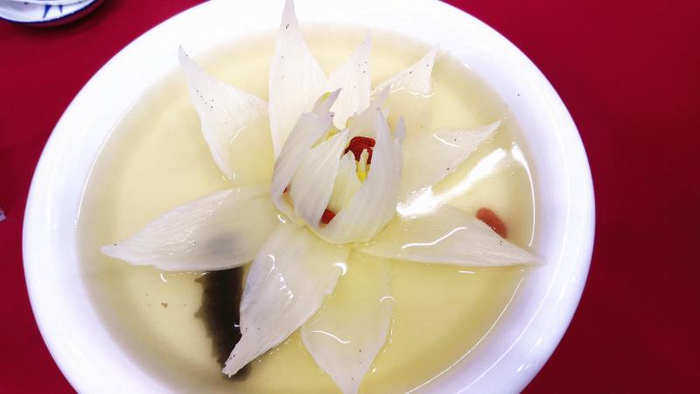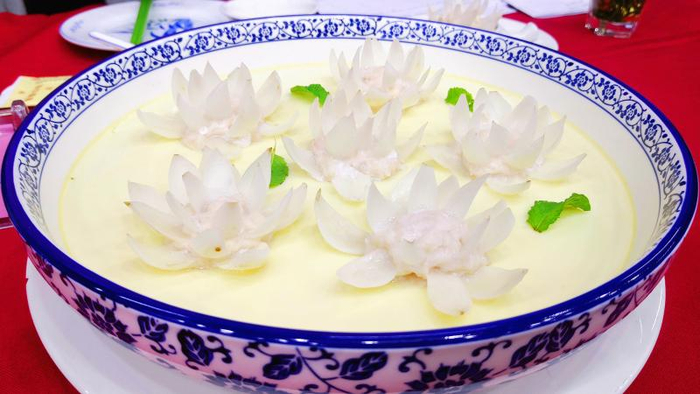 只见一只餐盘里,一朵白色“荷花”羞涩紧闭,但被滚烫的鸡汤从头到脚浇透后,“荷花”竟然缓缓盛开了。如果不仔细查看这朵荷花花瓣上的纹路,很难发觉这又是一朵假荷花,扮演它的是大白菜。