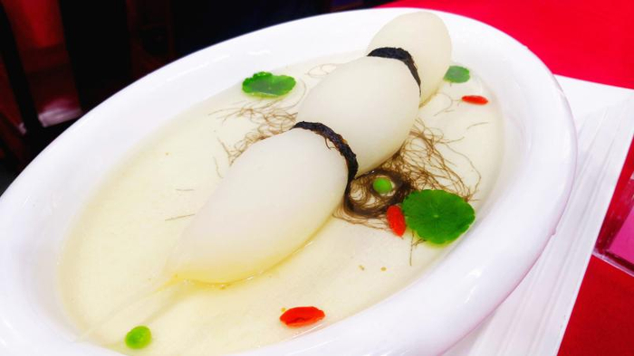 再看“鸡汁象形藕”,清透的鸡汤里,躺着一只肥大的“莲藕”,可浓郁的萝卜味“出卖”了它,原来竟是白萝卜假扮的。