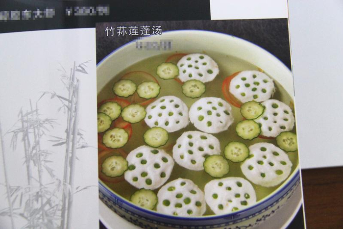 比如2016年在“荷香盛宴”上获奖的“竹荪莲蓬汤”,清澈的高汤上,漂浮着数片雪白的“莲藕”,青绿的“莲子”还嵌在“藕”内,可夹起一片放入口中,竟然不是脆的,是软的。