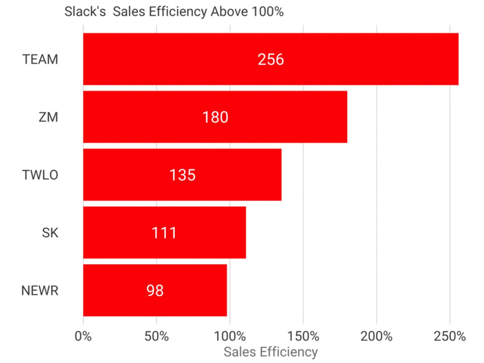 这个指标是销售效率,Slack 的销售效率超过 111%。简单来说,这意味着今年在销售和营销上每支出 1 美元,明年毛利将增加 1.11 美元。Zoom 的销售效率为180%,更可怕。