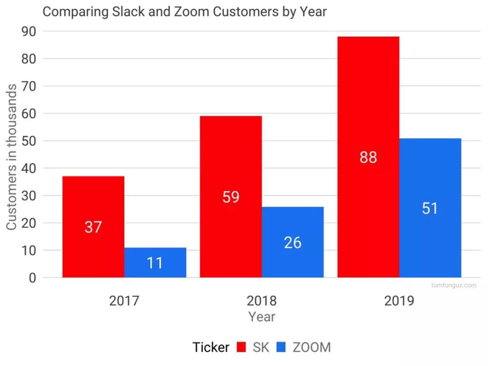 Slack 2017 年的收入 1.05 亿美元,2018年 2.21 亿美元,2019 年 4.01 亿美元(财政年度而非自然年,Slack 的算法是当年 1 月 31 日结束)。Zoom 的收入分别为 6100 万美元、1.51 亿美元和 3.31 亿美元。