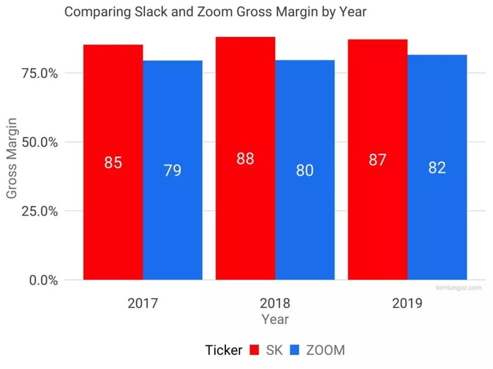 从毛利率来看,Slack 毛利率比 Zoom 高 6 个点左右。
