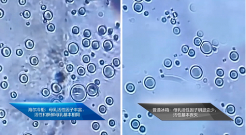 海尔冷柜用母乳对比实验证实了专业的储奶技术实力。实验中,海尔冷柜专业冷冻6天后的母乳因子活性强,数量多,营养价值高;而普通冷冻的因子却呈现完全不同的形态:活性弱,数量少,营养流失严重。