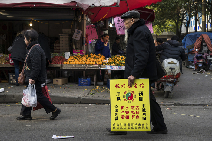 2017年03月03日,江苏无锡,一名算命先生游走在马路上招揽顾客。图片来自视觉中国