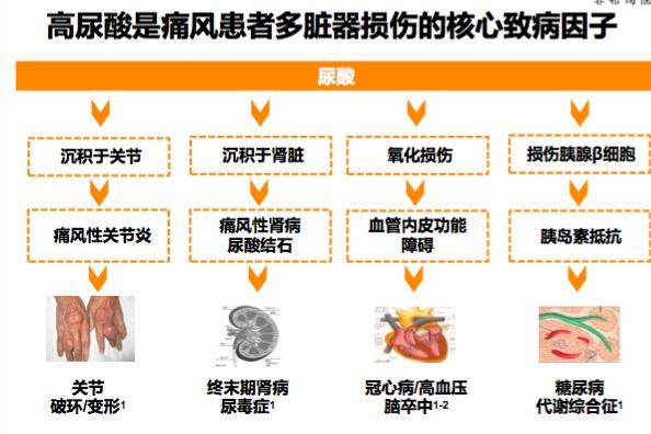 痛风治疗控血尿酸是关键痛风与高尿酸血症直接相关,而且长期高尿酸血症还会引起或加重其他多器官损伤,并发肾脏病变(急性尿酸性肾病、慢性尿酸盐肾病、肾石症)、高血糖、血脂紊乱、高血压、冠心病、心功能不全及卒中等。