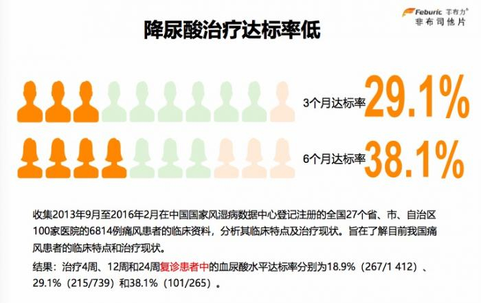 根据国家风湿病数据中心(CRDC)中国痛风疾病数据显示,痛风患者治疗4周、12周和24周的随访率依次降低,分别为20.7%、10.8%和3.9%,即能坚持半年随访的痛风患者不足4%。与此同时,痛风患者的降尿酸治疗达标率在用药半年后也仅有38%。