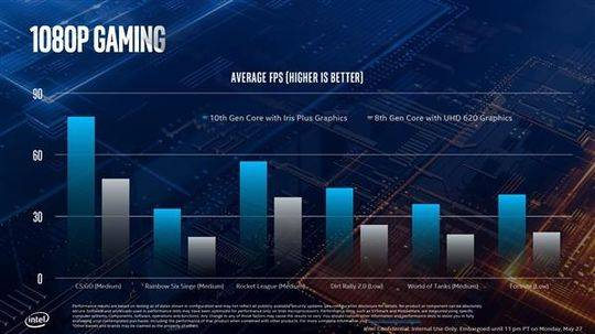 英特尔宣称,48/64单元的Iris Plus核显可以保证多数游戏大作的平均帧率超过30FPS,部分还能突破60FPS。