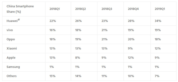 2018年Q4全球智能机出货量(来源:Counterpoint)