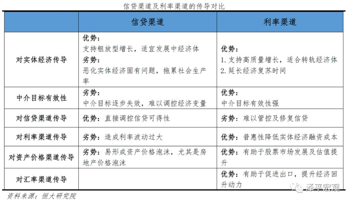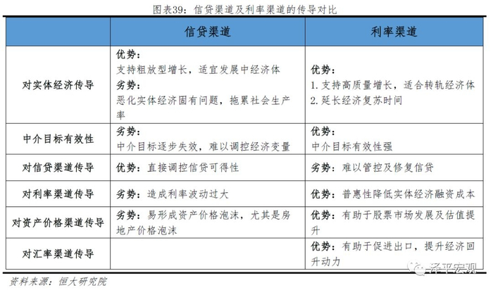 对比两大类货币政策传导渠道,信贷渠道整体来看弊大于利,一方面追赶型经济体的意义重大,但另一方面其结构性易恶化实体经济固有问题,拖累社会生产率,除信贷渠道自身的传导较为通畅外,对利率渠道的传导易造成利率波动过大,在资产价格方面易形成房地产泡沫,且数量型中介目标面临着可测性、可控性以及相关性均不断下降的压力。而利率渠道整体来看利大于弊,传导机制更为市场化且更加灵活,能够有效改善数量型传导所带来的负面影响,具体来说:
