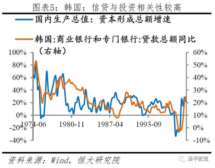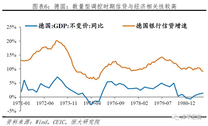 从我国情况来看,实施数量型货币政策以来,贷款增速与资本形成对GDP贡献率之间的相关性达到0.74,信贷有效支持内需,尤其对投资的融资支持有着显著贡献。韩国在数量型货币政策下,信贷增速同样与资本形成有着较高拟合度,1974年到1999年两者相关性达到0.57。德国的信贷增速与资本形成拟合度一般,但信贷增速与GDP增速相关性较高,在80年代货币政策操作框架转型之前相关性达0.72。
